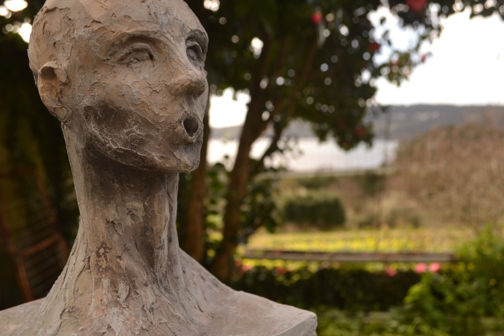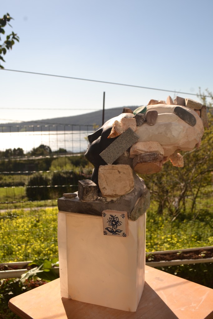 Chamuscas habla de un estado de ánimo que se refleja en una acción, está realizado en cerámica cocida por reducción, granito y alabastro. 45x32x50cm